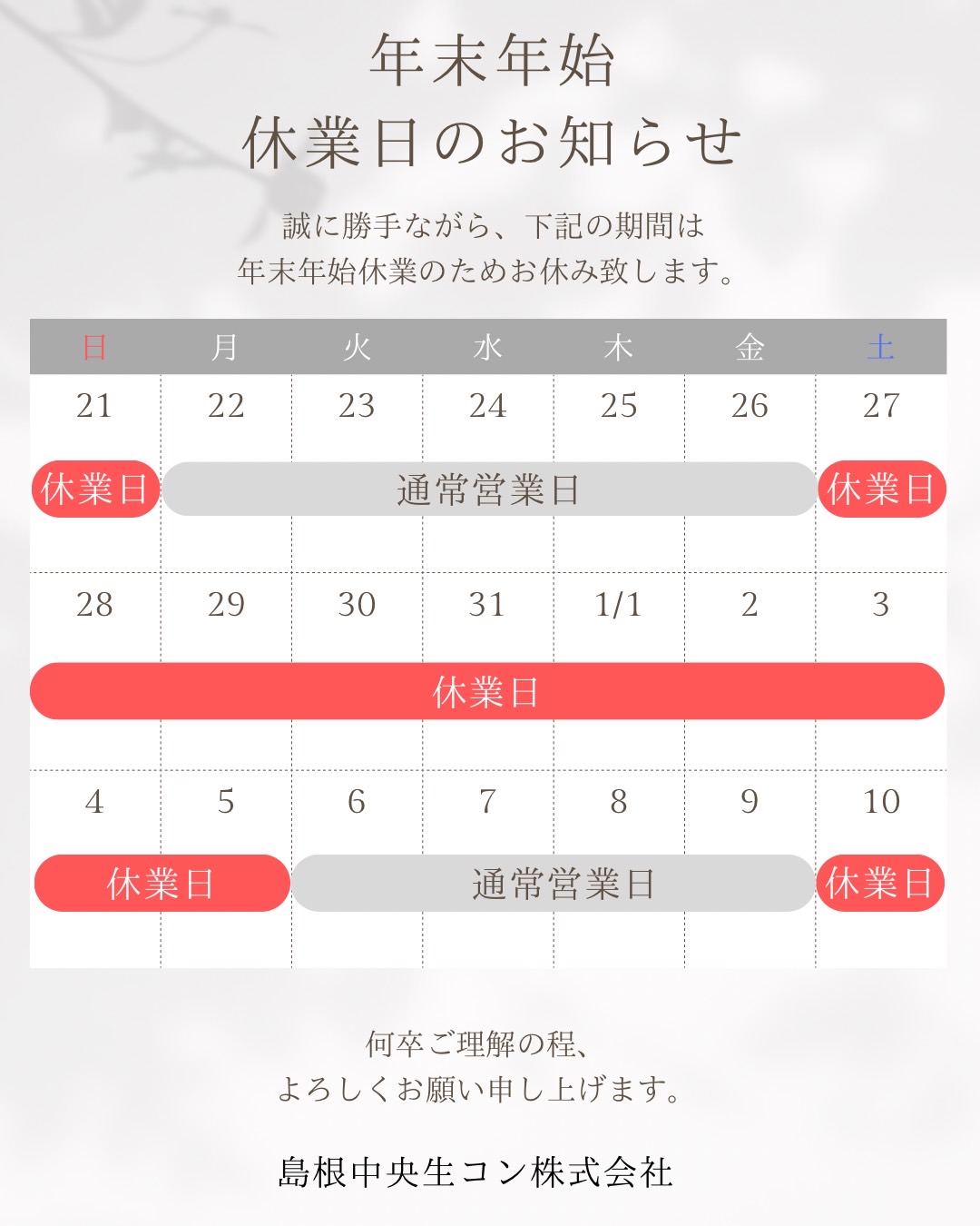 年末年始休暇のため下記日程を休業させていただきます。 202...続きを読む